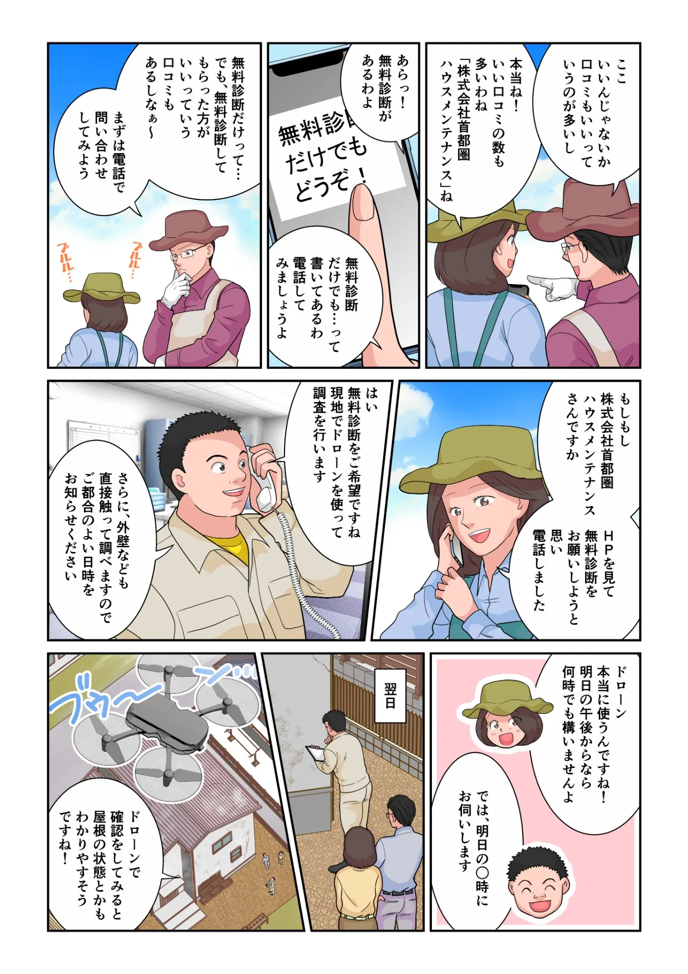 めぐみ「もしもし、株式会社首都圏ハウスメンテナンスさんですか。HPを見て無料診断をお願いしようと思い電話しました」