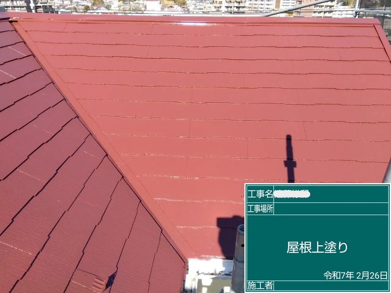 相模原市緑区橋本 E 様邸 屋根外壁塗装工事 2025/03/21 工事物件住所:相模原市緑区橋本 工事内容詳細:屋根・外壁塗装工事 【使用材料】 屋根:スーパーシャネツサーモF(9118:バーガンディ) 外壁:フッ素REVO1000-IR(遮熱)( 9003:ホワイトリリィ 8097:ライトラテ) 予算:135万円(税込) 施工前後比較写真 屋根施工前後比較写真 高圧洗浄作業 養生作業 外壁下塗り 外壁中塗り 外壁上塗り 屋根下塗り 屋根中塗り 屋根上塗り 付帯部塗装